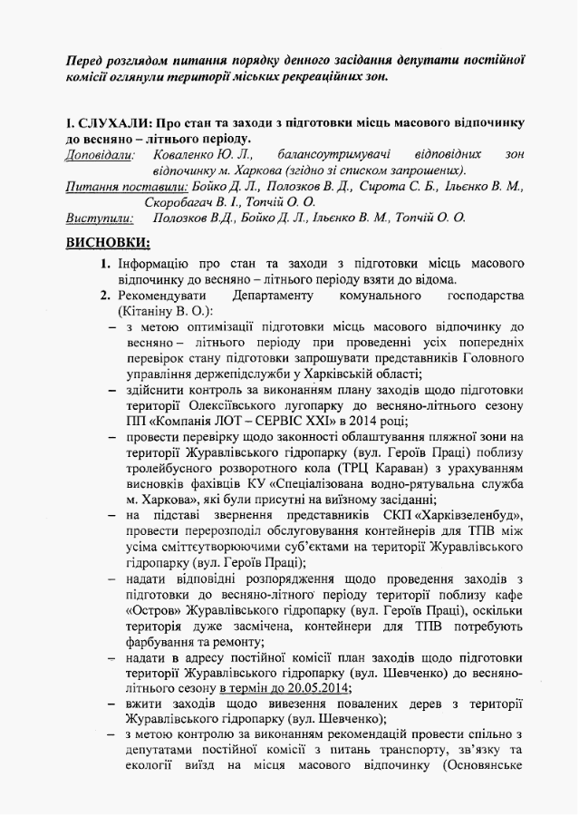 Протокол № 70 иїздного засідання постійної комісії Харківської міської ради очаток проведення: Олексіївський лугопарк