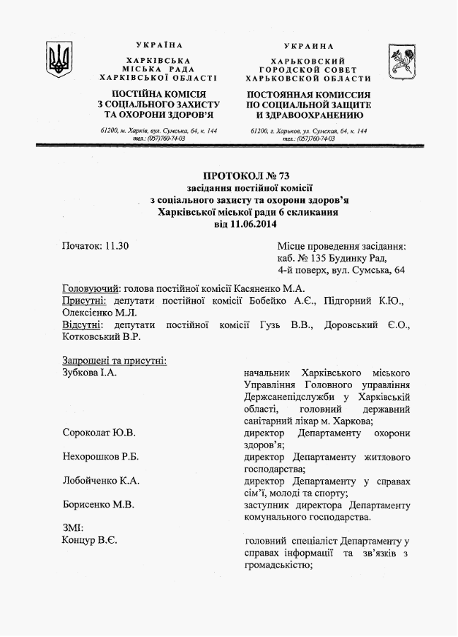 ПРОТОКОЛ № 73 засідання постійної комісії з соціального захисту та охорони здоров'я Харківської міської ради 6 скликання від 11.06.2014