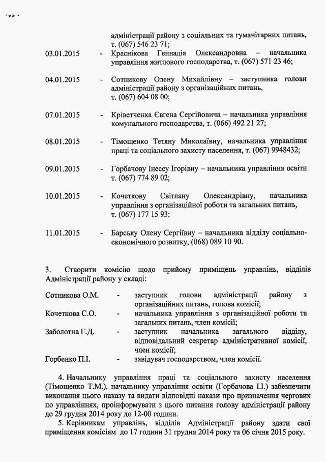 Про перенесення робочих днів у 2015 році та призначення відповідальних чергових по Адміністрації Ленінського району Харківської міської ради у святкові та вихідні дні