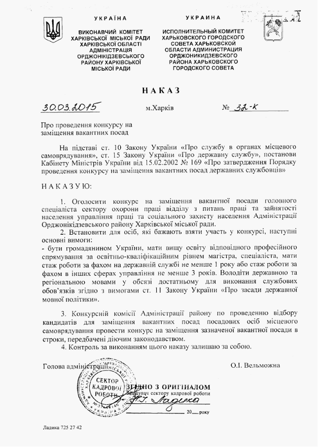 УКРАИНА ИСПОЛНИТЕЛЬНЫЙ КОМИТЕТ ХАРЬКОВСКОГО ГОРОДСКОГО СОВЕТА ХАРЬКОВСКОЙ ОБЛАСТИ АДМИНИСТРАЦИЯ ОРДЖОНИКИДЗЕВСКОГО РАЙОНА ХАРЬКОВСКОГО ГОРОДСКОГО СОВЕТА |